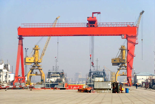 用于船臺拼裝船體,常備有兩臺起重小車:一臺有兩個主鉤,在橋架上翼緣的軌道上運行;另一臺有一個主鉤和一個副鉤,在橋架下翼緣的軌道上運行,以便翻轉和吊裝大型的船體分段。起重量一般為100~1500噸;跨度達185米;起升速度為2~15米/分,還有0.1~0.5米/分的微動速度。