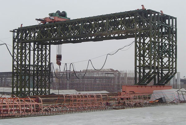 用于船臺拼裝船體,常備有兩臺起重小車:一臺有兩個主鉤,在橋架上翼緣的軌道上運行;另一臺有一個主鉤和一個副鉤,在橋架下翼緣的軌道上運行,以便翻轉和吊裝大型的船體分段。起重量一般為100~1500噸;跨度達185米;起升速度為2~15米/分,還有0.1~0.5米/分的微動速度。